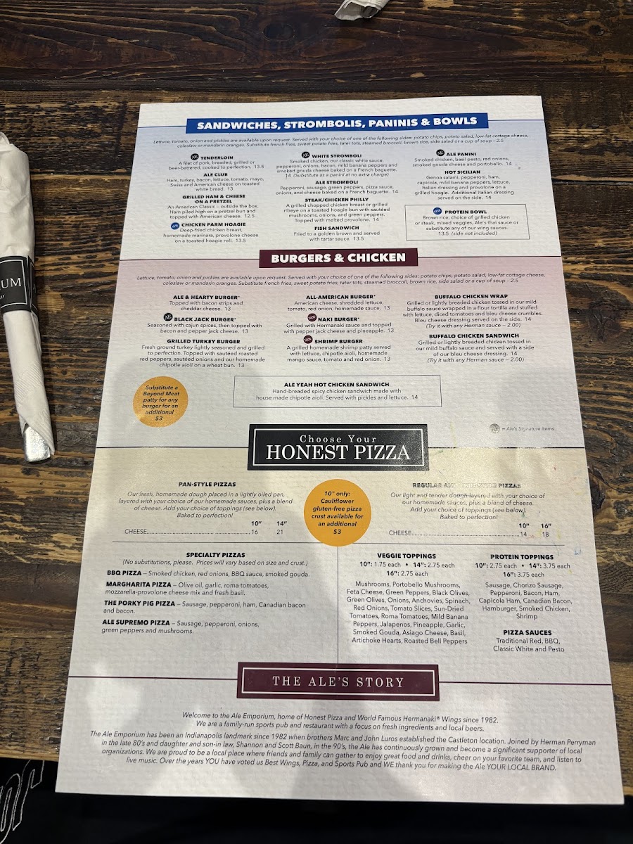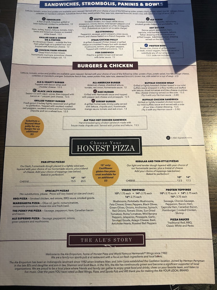 Ale Emporium, located at 997 E County Line Rd B, Greenwood, IN, is a culinary gem that delights pizza lovers and casual diners alike. Their menu features an array of 10" pizzas, including the flavorful BBQ Pizza, topped with smoked chicken and gouda, and the classic Margherita Pizza, bursting with fresh basil and tomatoes. For a hearty option, try the indulgent Porky Pig Pizza, loaded with multiple meats. Families will appreciate the kids menu, offering favorites like chicken tenders and grilled cheese at wallet-friendly prices. Customers rave about the attentive service, noting friendly staff who ensure a pleasant dining experience. Highlights such as their refreshing salads and scrumptious desserts like cookie and ice cream add to the overall appeal, making Ale Emporium a must-visit for anyone seeking delicious food and a welcoming atmosphere.